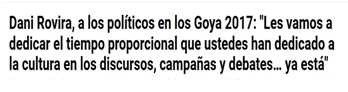 L'èxit més gran d'un àrbitre és passar desapercebut. Si consideréssim la Gala del Premis Goya l'àrbitre del cine espanyol, podria morir d'èxit després de la cerimònia del passat 4 de febrer. L'acte no va brillar especialment, i les reivindicacions no es van alçar com en edicions com la del 2013, el 2014, el 2015 o el 2016. Només les portades ja ho il·lustren: mentre en anys anteriors es parla de "Mítines antigobierno", "otros Goya politizados" o "hacer cine hoy es un acto heroico", aquest 2017, la reivindicació no ha estat gairebé gens patent.